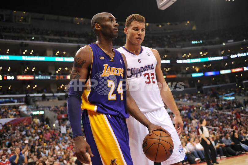 試合に臨むレイカーズのコービー・ブライアント(Kobe Bryant、手前)とクリッパーズのブレイク・グリフィン(Blake Griffin、2013年4月7日撮影)。(c)AFP/Getty Images/NBAE/Noah Graham
