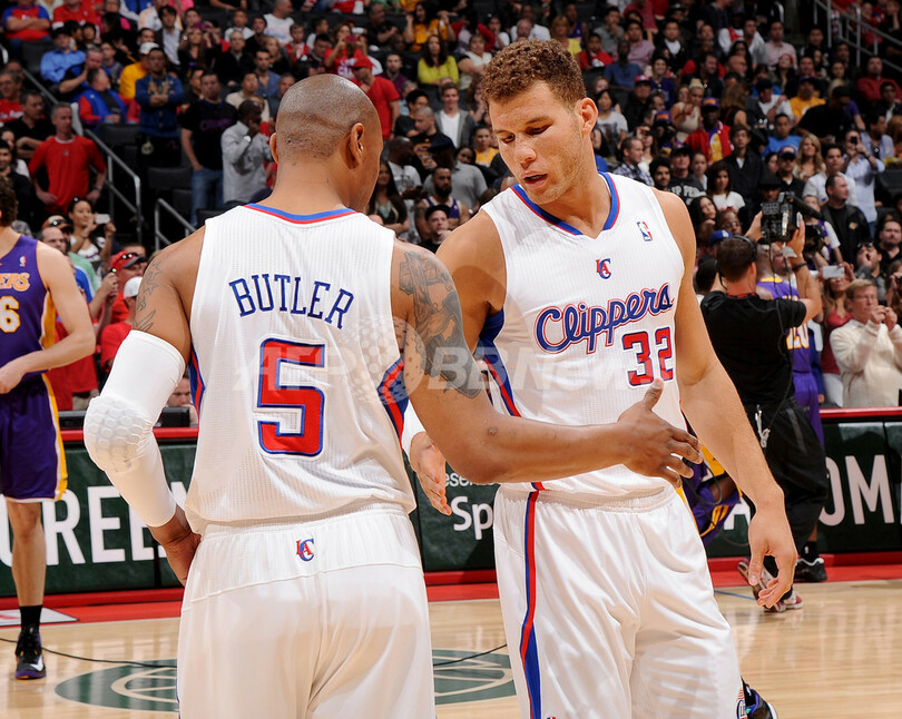 試合に臨むクリッパーズのカロン・バトラー(Caron Butler、左)とブレイク・グリフィン(Blake Griffin、2013年4月7日撮影)。(c)AFP/Getty Images/NBAE/Andrew D. Bernstein