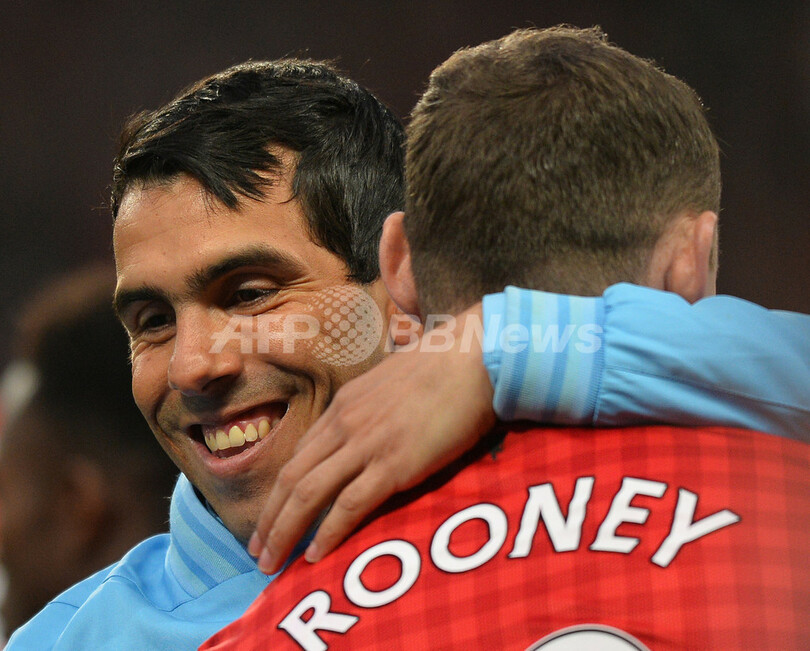 試合開始前にマンチェスター・ユナイテッドのウェイン・ルーニー(Wayne Rooney)と抱き合うマンチェスター・シティのカルロス・テベス(Carlos Tevez、2013年4月8日撮影)。(c)AFP/PAUL ELLIS