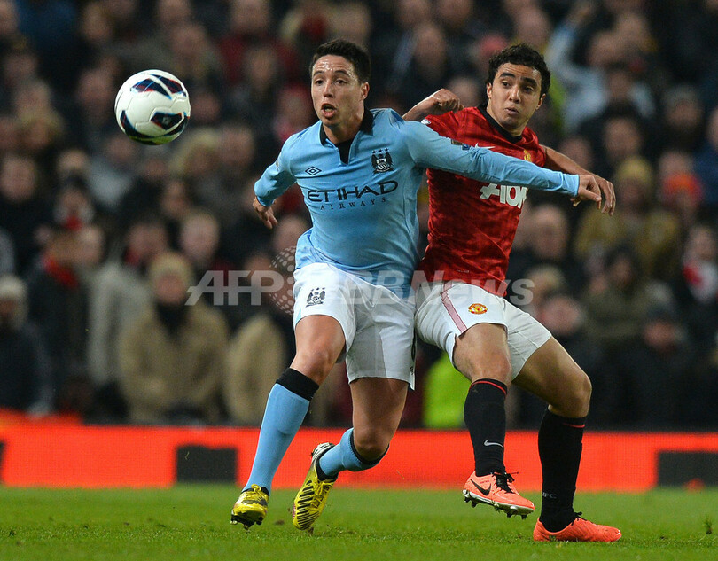 ボールを競るマンチェスター・ユナイテッドのラファエウ・ダ・シウバ(Rafael da Silva)とマンチェスター・シティのサミル・ナスリ(Samir Nasri、2013年4月8日撮影)。(c)AFP/PAUL ELLIS