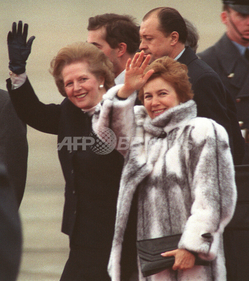 写真は、米ワシントンD.C.(Washington D.C.)郊外の空軍基地を出発するミハイル・ゴルバチョフ(Mikhail Gorbachev)書記長の妻、ライサ(Raisa Gorbachev)夫人(右)と記者らに手を振るサッチャー英首相(肩書きはいずれも当時、1987年12月7日撮影)。(c)AFP/MARCEL MOCHET