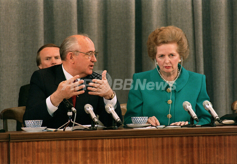 写真は、ソ連のモスクワ(Moscow)で共同記者会見に臨むミハイル・ゴルバチョフ(Mikhail Gorbachev)ソ連大統領(左)とサッチャー英首相(肩書きはいずれも当時、1990年6月8日撮影)。(c)AFP/VITALY ARMAND