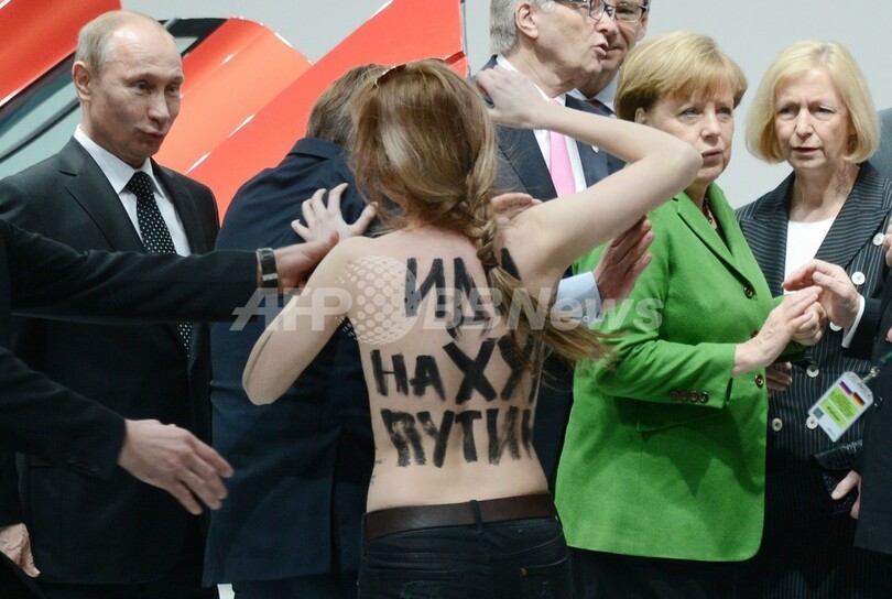 プーチン大統領がアンゲラ・メルケル(Angela Merkel)独首相と一緒にフォルクスワーゲン(Volkswagen)の新型モデルについて説明を受けていたところ、上半身裸の女性4人が現れ、ロシア政府による非政府組織(NGO)の弾圧について抗議した。ロシアで活動する国際NGOの多くが最近、当局の捜索を受けている。女性たちは警備員に連行された。