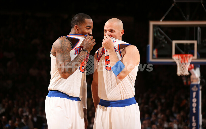 コート上で言葉を交わすニューヨーク・ニックスのJ・R・スミス(J.R. Smith、左)とジェイソン・キッド(Jason Kidd、2013年4月9日撮影)。(c)AFP/Getty Images/NBAE/Nathaniel S. Butler