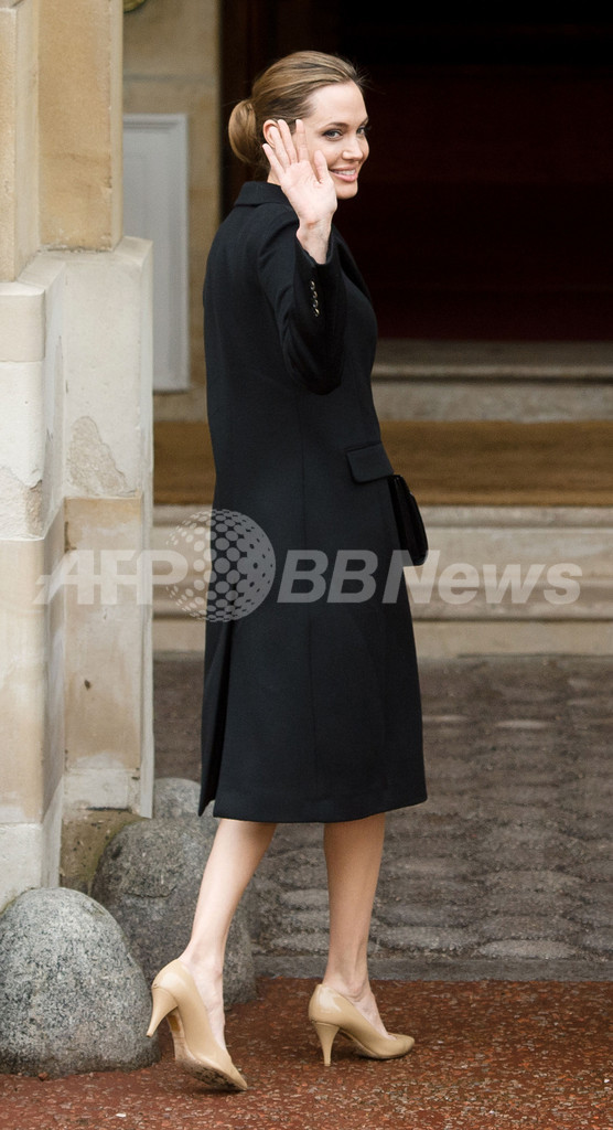 写真は、会合が開かれたランカスター・ハウス(Lancaster House)に到着し、集まった人々に手を振るジョリーさん(2013年4月11日撮影)。(c)AFP/LEON NEAL