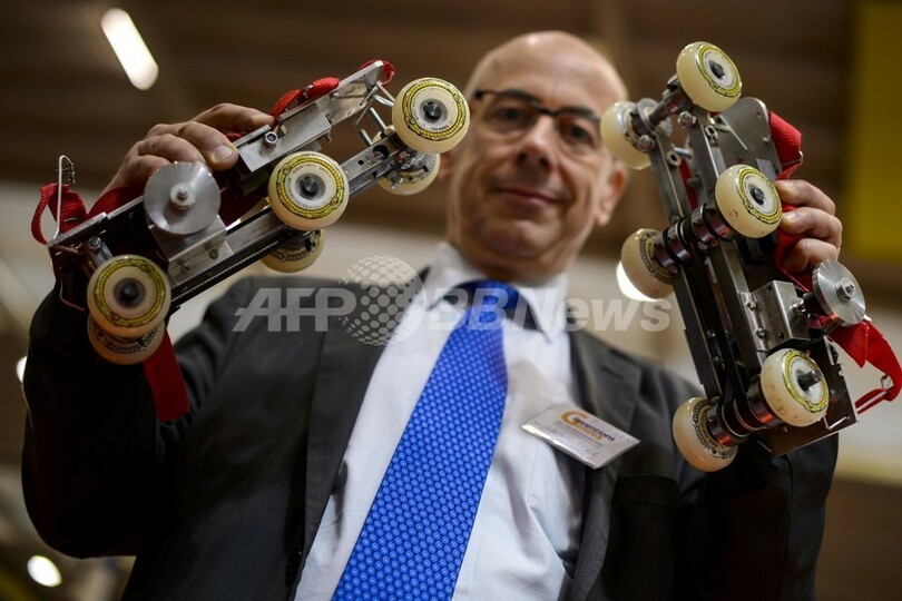 時速10キロメートルで走れるスケート靴、「ロールカーズ(Rollkers)」を出展したシャバンさんはAFPの取材に、「新技術はもうたくさんだと思ったんだ。だから、古き良き技術に注目した」と説明した。おもちゃの車がトラクション動力で走るのと似たコンセプトで、スケート靴を履いた人の体重と動きを動力に使い、さらに靴が後ろ向きに滑るのを防止したという。