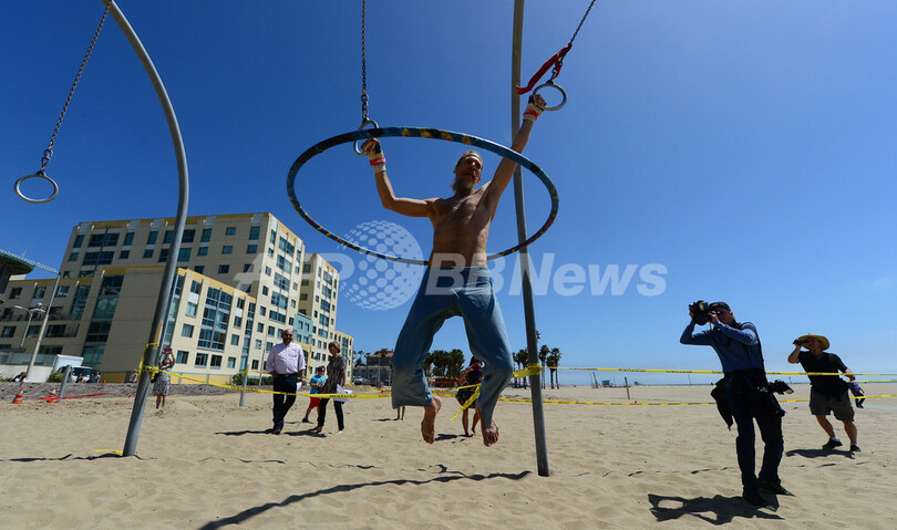 【4月12日 AFP】「フラフープを回しながら、つり輪を移動する」ギネス世界記録(Guiness World Records)の認定を目指している米国人男性ジェフリー・ナッシュ(Jeffrey Nash)さん(51)が10日、米カリフォルニア(California)州サンタモニカ(Santa Monica)のビーチで公式の認定員を招いて実演を行った。(c)AFP