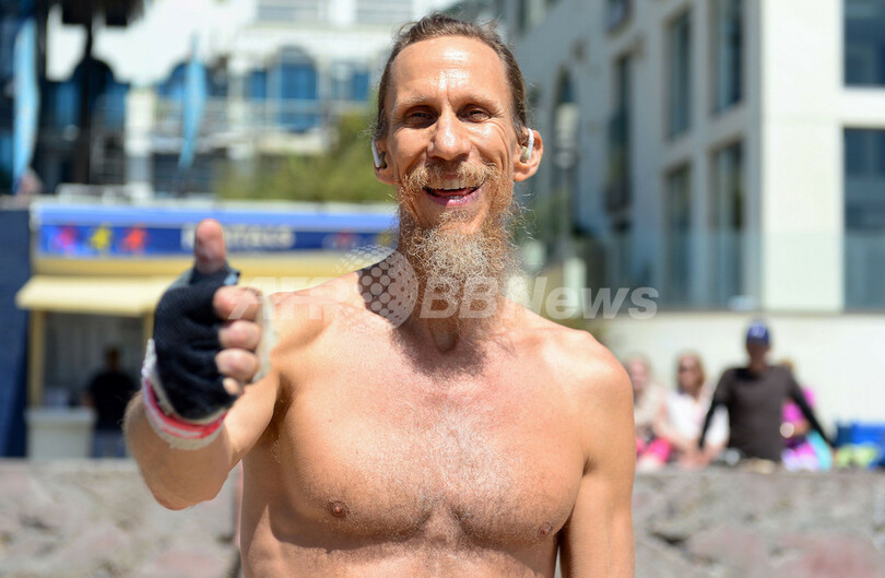 【4月12日 AFP】「フラフープを回しながら、つり輪を移動する」ギネス世界記録(Guiness World Records)の認定を目指している米国人男性ジェフリー・ナッシュ(Jeffrey Nash)さん(51)が10日、米カリフォルニア(California)州サンタモニカ(Santa Monica)のビーチで公式の認定員を招いて実演を行った。(c)AFP