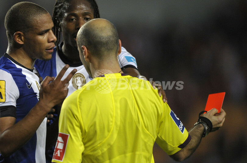 主審にレッドカードを提示され、チームメイトのフェルナンド(Fernando Francisco Reges、左)と抗議するFCポルトのアブドゥライ・バ(Abdoulaye Ba、中央、2013年4月13日撮影)。(c)AFP/MIGUEL RIOPA