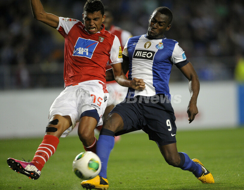 ボールを競るFCポルトのジャクソン・マルティネス(Jackson Martinez、右)とSCブラガのアデルラン・サントス(Aderllan Santos、2013年4月13日撮影)。(c)AFP/MIGUEL RIOPA