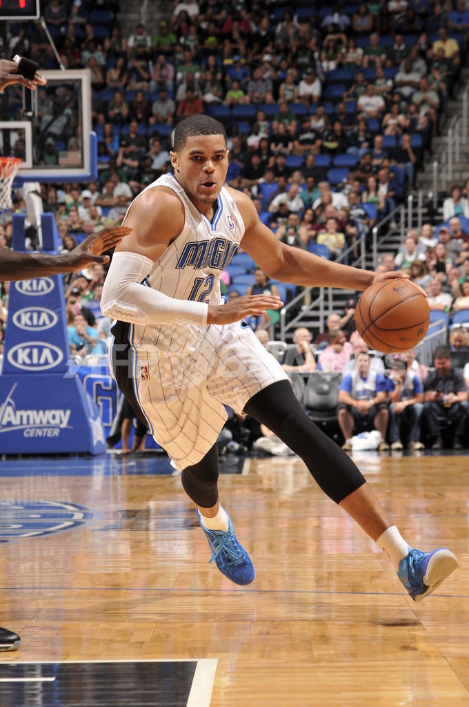 ドライブを仕掛けるオーランド・マジックのトビアス・ハリス(Tobias Harris 、2013年4月13日撮影)。(c)AFP/Getty Images/NBAE/Fernando Medina