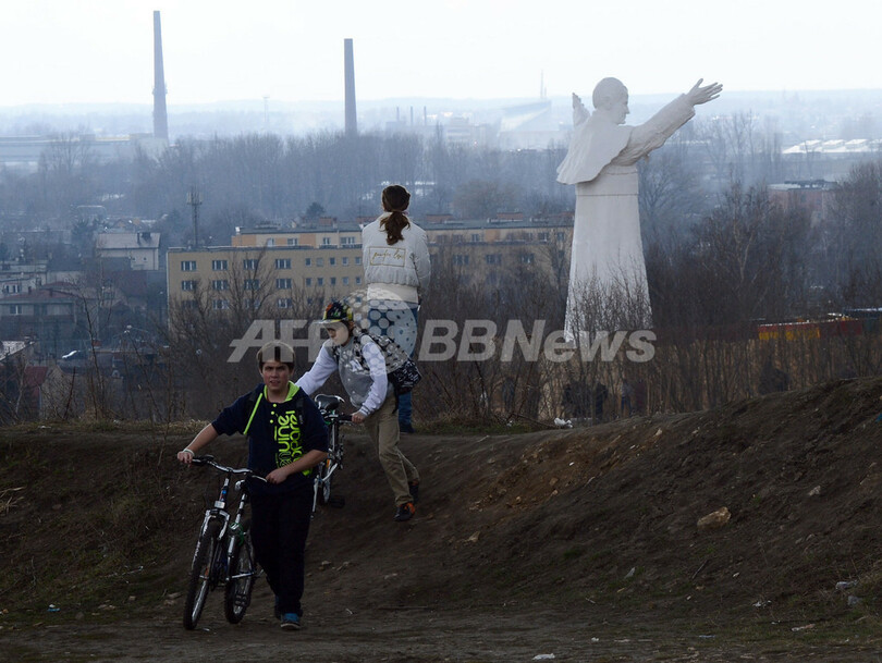 【4月15日 AFP】ポーランド南部チェンストホバ(Czestochowa)で13日、故ローマ法王ヨハネ・パウロ2世(John Paul II)の巨像の除幕式が行われた。子どもたちの歌声が響く中、披露された巨像は13.8メートルの高さを誇り、現存するヨハネ・パウロ2世像の中でも世界最大級。早くも奇跡をもたらすことが期待されている。(c)AFP