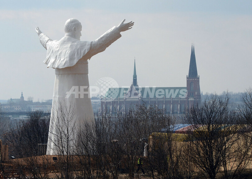 【4月15日 AFP】ポーランド南部チェンストホバ(Czestochowa)で13日、故ローマ法王ヨハネ・パウロ2世(John Paul II)の巨像の除幕式が行われた。子どもたちの歌声が響く中、披露された巨像は13.8メートルの高さを誇り、現存するヨハネ・パウロ2世像の中でも世界最大級。早くも奇跡をもたらすことが期待されている。(c)AFP