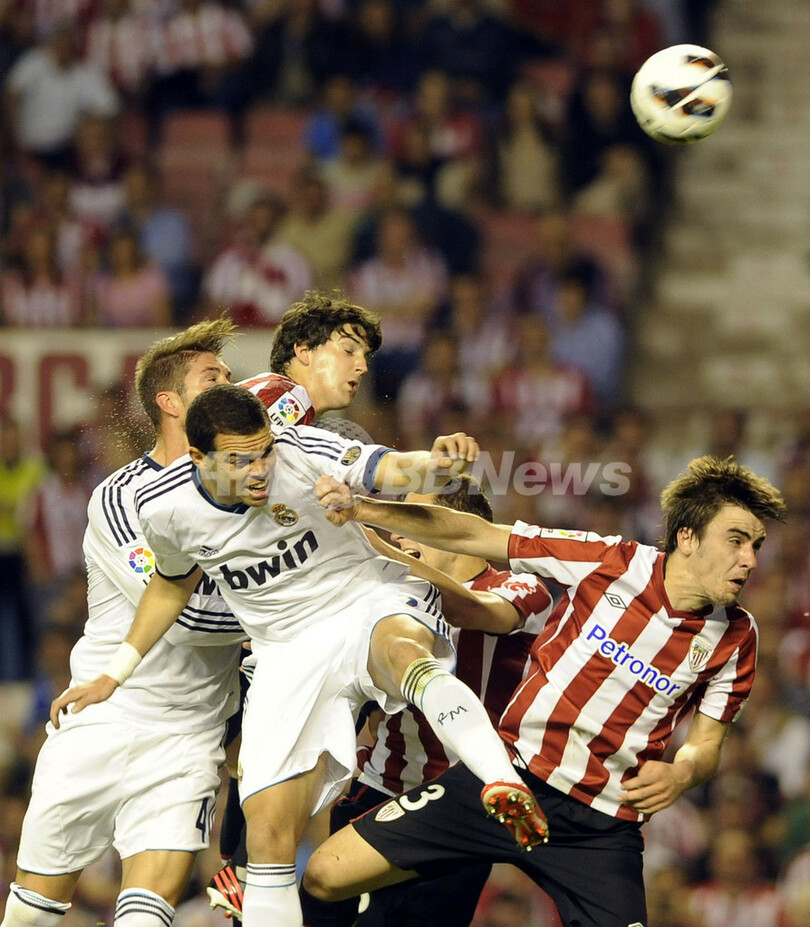 アスレティック・ビルバオのホン・アウルテネチェ(Jon Aurtenetxe、右)と空中のボールを競るレアル・マドリードのペペ(Pepe、左から2人目、2013年4月14日撮影)。(c)AFP/RAFA RIVAS