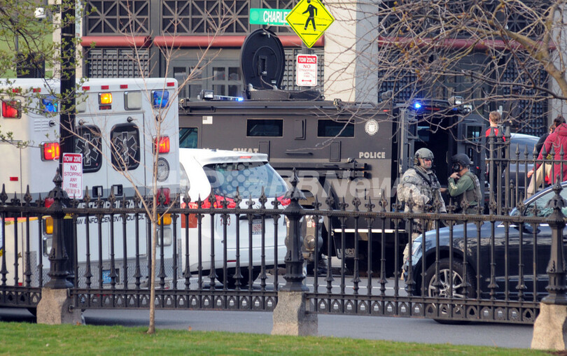 写真は爆発の現場近くを警備する軍や州警察の関係者ら(2013年4月15日撮影)。(c)AFP/John MOTTERN