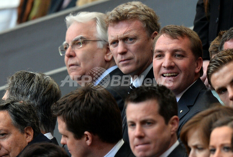 式典に出席する(左から)エバートン(Everton)のビル・ケンライト(Bill Kenwright)会長、デビッド・モイーズ(David Moyes)監督、リバプールのブレンダン・ロジャーズ(Brendan Rodgers) 監督(2013年4月15日撮影)。(c)AFP/PAUL ELLIS