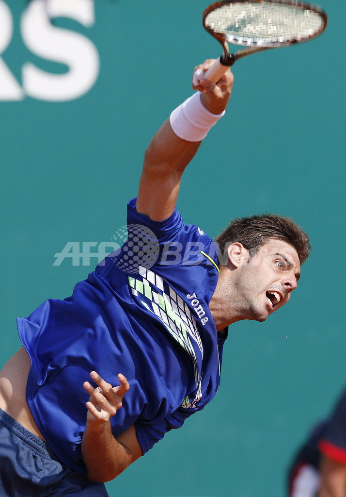 サーブを打つマルセル・グラノジェルス・プジョル(2013年4月17日撮影)。(c)AFP/VALERY HACHE