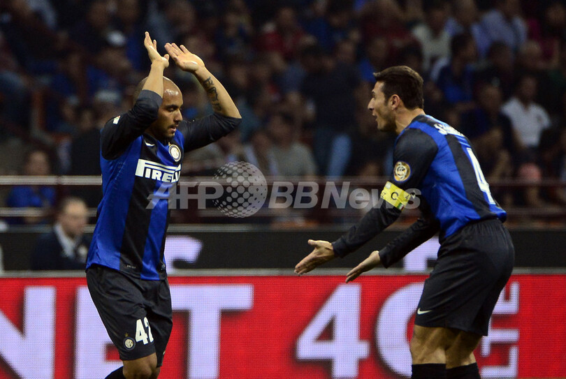 前半22分に先制点を挙げてチームメイトのハビエル・サネッティ(Javier Zanetti)と喜びを分かち合うインテルのジョナタン・シセロ・モレイア(Jonathan Cicero Moreira)2013年4月17日撮影)。(c)AFP/OLIVIER MORIN