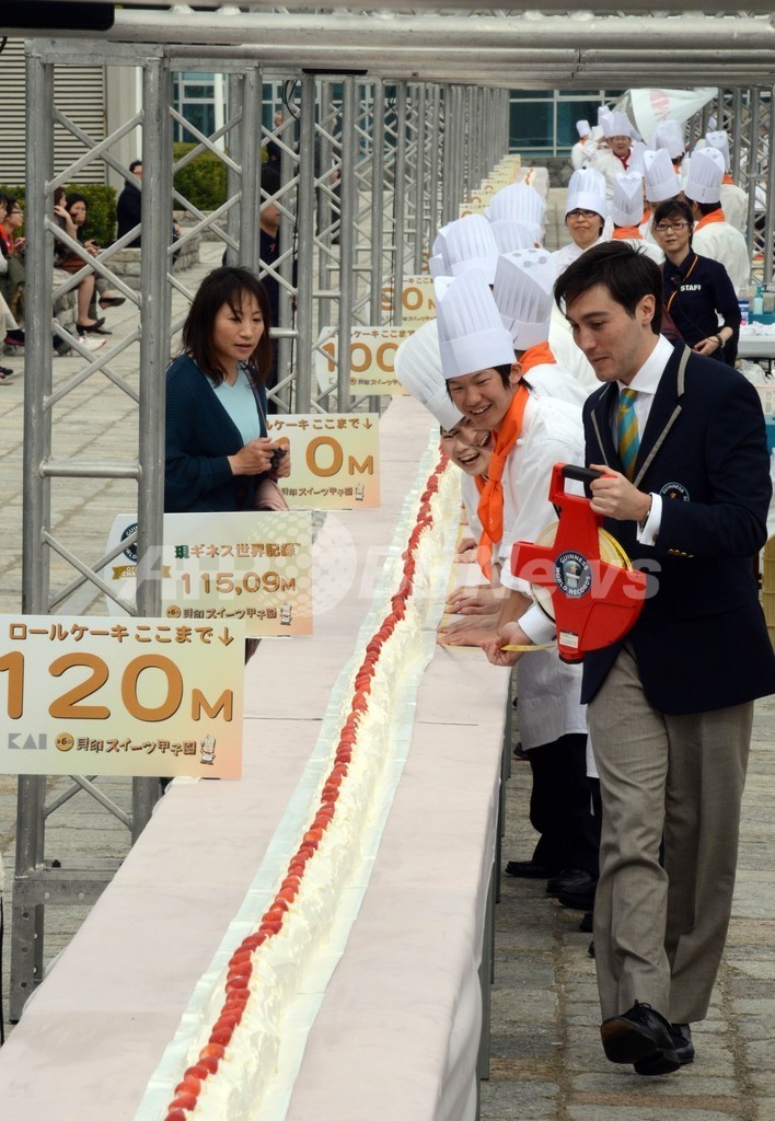 ニュース ライフ こぼれ話 130メートル超の世界一長いロールケーキ、ギネスに認定 都内 2013年4月18日 9:44 発信地:東京 [ アジア・オセアニア 東京 ] このニュースをシェア ‹ › ❮ 4/10 ❯ 都内で17日、世界一長いロールケーキのギネス世界記録に挑戦するイベントが行われた。パティシエと専門学校の生徒約90人が参加。小麦粉54キロ、砂糖43キロ、卵2682個を使って完成させたロールケーキの長さは130メートル68センチ。これまでの記録115メートル9センチを抜き、見事にギネス記録に認定された(2013年4月17日撮影)。(c)AFP/Yoshikazu TSUNO 画像作成中 ! 【4月18日 AFP】都内で17日、世界一長いロールケーキのギネス世界記録に挑戦するイベントが行われた。パティシエと専門学校の生徒約90人が参加。小麦粉54キロ、砂糖43キロ、卵2682個を使って完成させたロールケーキの長さは130メートル68センチ。これまでの記録115メートル9センチを抜き、見事にギネス記録に認定された。(c)AFP ライフ 一覧へ> メディア・報道関係・法人の方向け 写真・動画 購入のお問合せ>