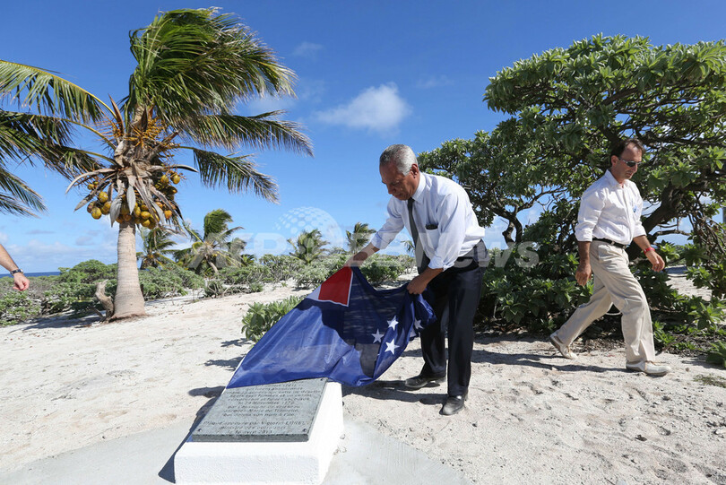 写真はトロメリン島の「忘れ去られた奴隷たち」の記念碑の除幕式に臨むリュレル海外領土相(中央、2013年4月16日撮影)。(c)AFP/RICHARD BOUET