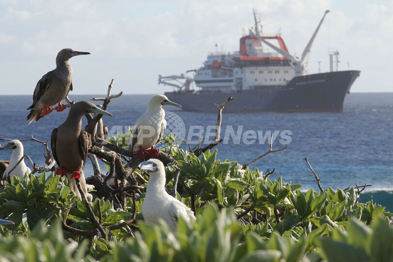 写真はトロメリン島で撮影したアカアシカツオドリ。背景には仏海洋調査船「マリオン・デュフレーヌ(Marion Dufresne)号」(2013年4月16日撮影)。(c)AFP/RICHARD BOUET