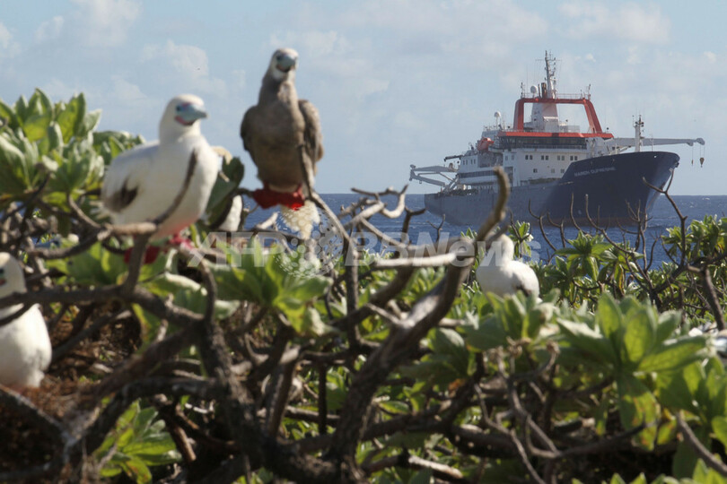 写真はトロメリン島で撮影したアカアシカツオドリ。背景には仏海洋調査船「マリオン・デュフレーヌ(Marion Dufresne)号」(2013年4月16日撮影)。(c)AFP/RICHARD BOUET