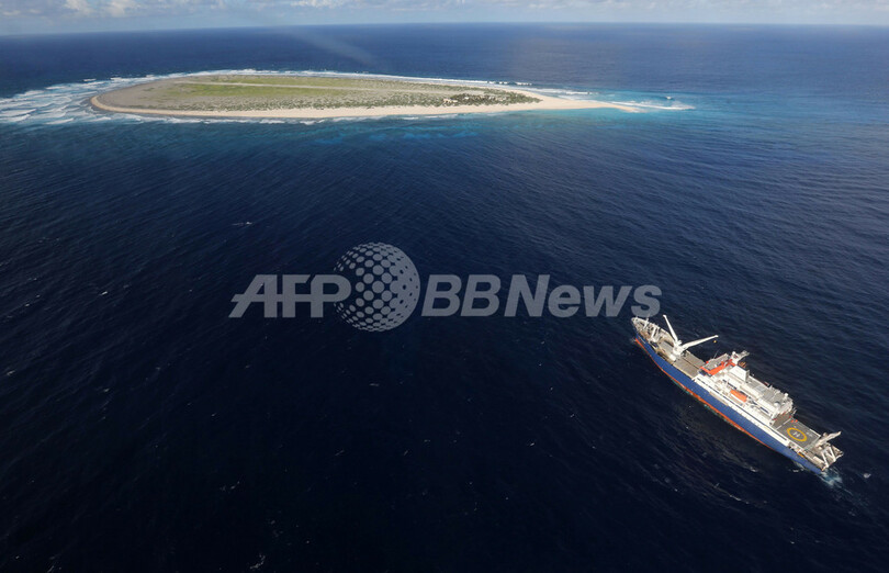 写真はトロメリン島と仏海洋調査船「マリオン・デュフレーヌ(Marion Dufresne)号」の空撮写真(2013年4月16日撮影)。(c)AFP/RICHARD BOUET
