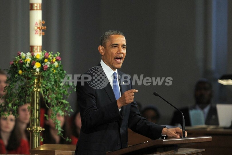 写真は、追悼式で演説するオバマ大統領(2013年4月18日撮影)。(c)AFP/Jewel Samad