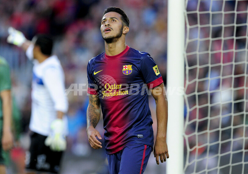 試合中、天を仰ぐFCバルセロナのティアゴ・ アルカンタラ(Thiago Alcantara do Nascimento、2013年4月20日撮影)。(c)AFP/JOSEP LAGO