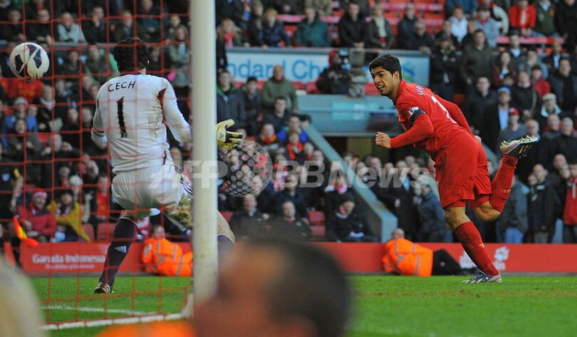 すると後半ロスタイム7分、そのスアレスがチェルシーのGKペトル・チェフ(Petr Cech)を破る劇的な同点のヘディングシュートを決めた。(c)AFP