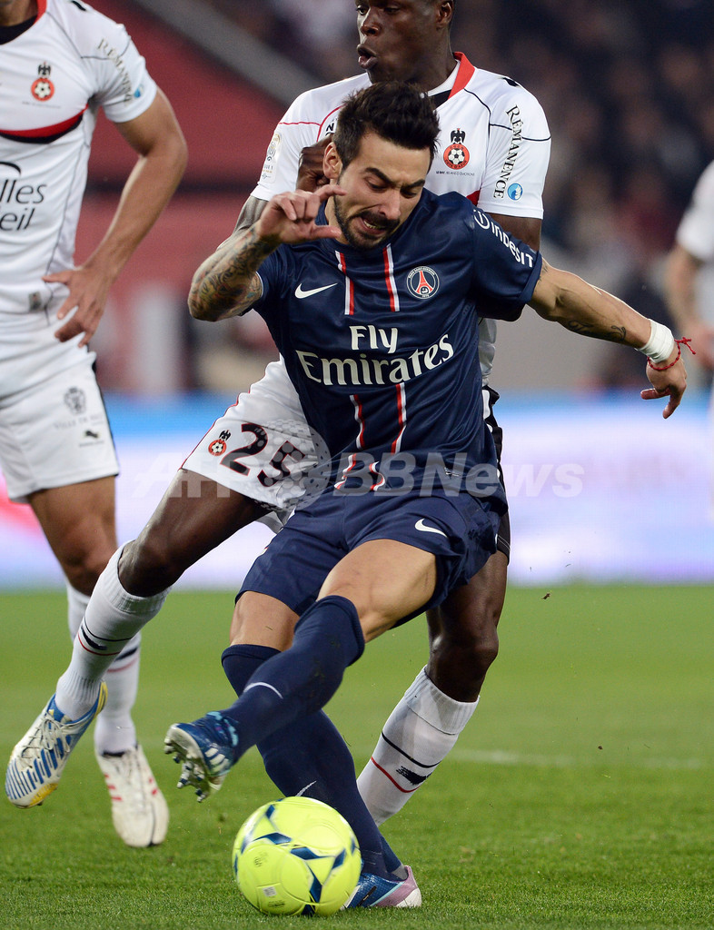 ボールをコントロールするPSGのエセキエル・ラベッシ(Ezequiel Lavezzi、手前、2013年4月21日撮影)。(c)AFP/FRANCK FIFE