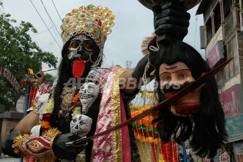 写真は北部パンジャブ(Punjab)州のアムリツァル(Amritsar) で行われたラム・ナバミの祭列に女神カーリー(Kali)に扮装(ふんそう)し加わる信者(2013年4月19日撮影)。(c)AFP/NARINDER NANU