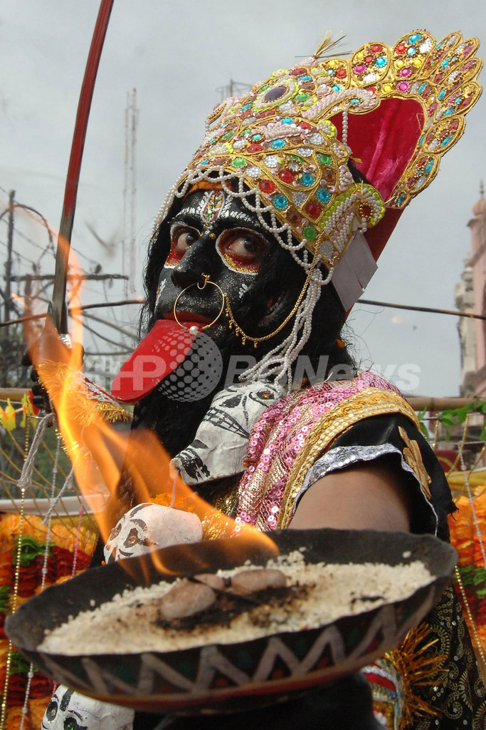写真は北部パンジャブ(Punjab)州のアムリツァル(Amritsar) で行われたラム・ナバミの祭列に女神カーリー(Kali)に扮装(ふんそう)し加わる信者(2013年4月19日撮影)。(c)AFP/NARINDER NANU
