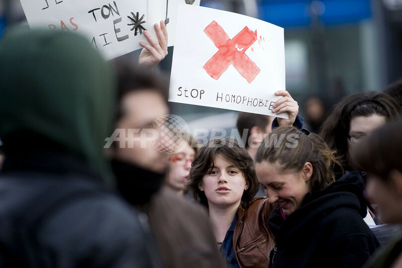 社会党のオランド大統領は昨年の大統領選で同性婚合法化を公約に掲げた。しかしカトリック教徒が大半を占めるフランスでは国を二分する問題になり、大規模なデモが行われて警官隊と衝突したり、一部の過激なグループが同性愛者やゲイバーを襲撃する事件も起きている。(c)AFP/Marion Thibaut