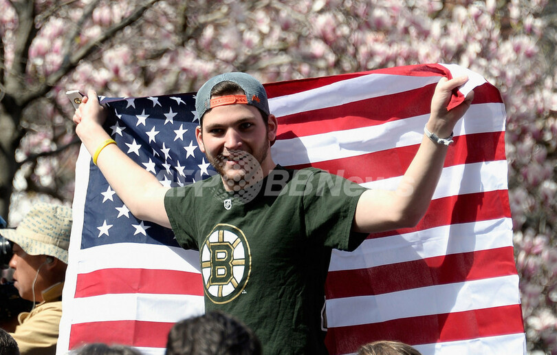 写真は現場近くで人々が黙とうする中、米国旗を掲げる男性(2013年4月22日撮影)。(c)AFP/Getty Images/Kevork Djansezian