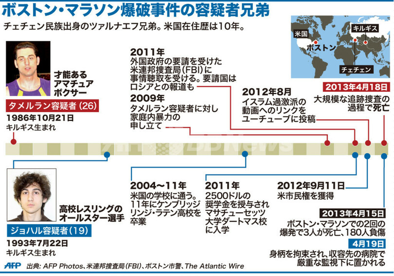 ニュース 社会 【図解】ボストン・マラソン爆破事件の容疑者兄弟の略歴 2013年4月23日 17:26 発信地:その他 [ 例外 その他 ] このニュースをシェア (c)AFP 【4月23日 AFP】15日に米マサチューセッツ(Massachusetts)州ボストン(Boston)で起きた爆破事件の容疑者兄弟の略歴を表した図。(c)AFP 社会 一覧へ> メディア・報道関係・法人の方向け 写真・動画 購入のお問合せ>