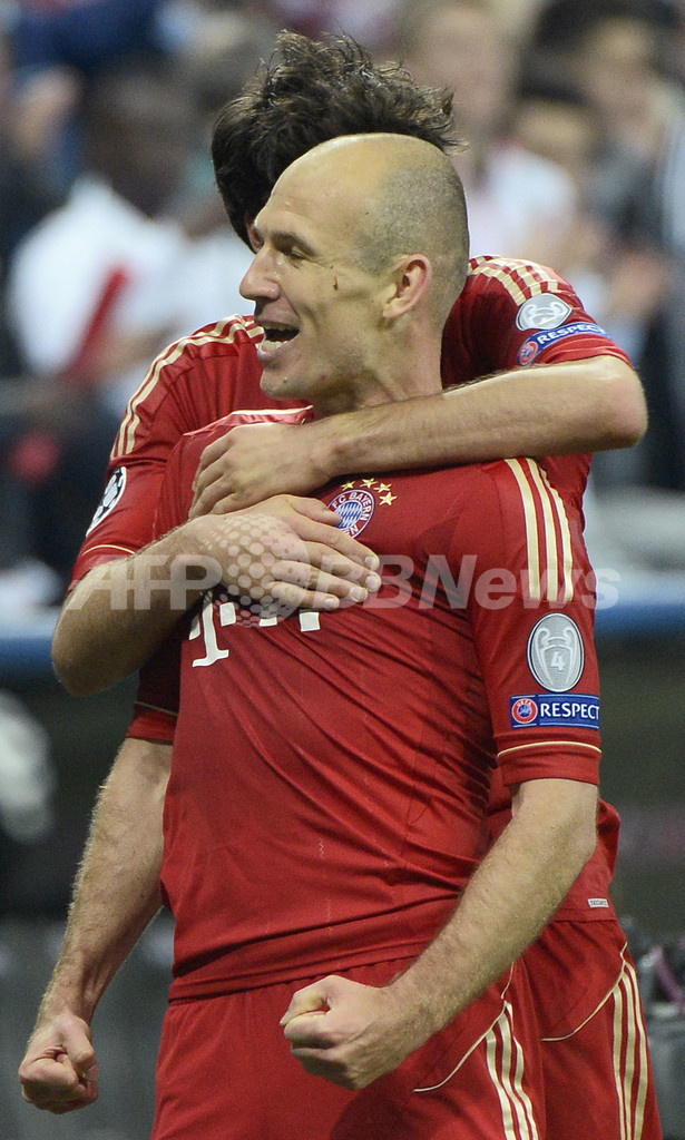 後半18分にチーム3得点目を挙げて歓喜するバイエルン・ミュンヘンのアリエン・ロッベン(Arjen Robben、2013年4月23日撮影)。(c)AFP/PIERRE-PHILIPPE MARCOU
