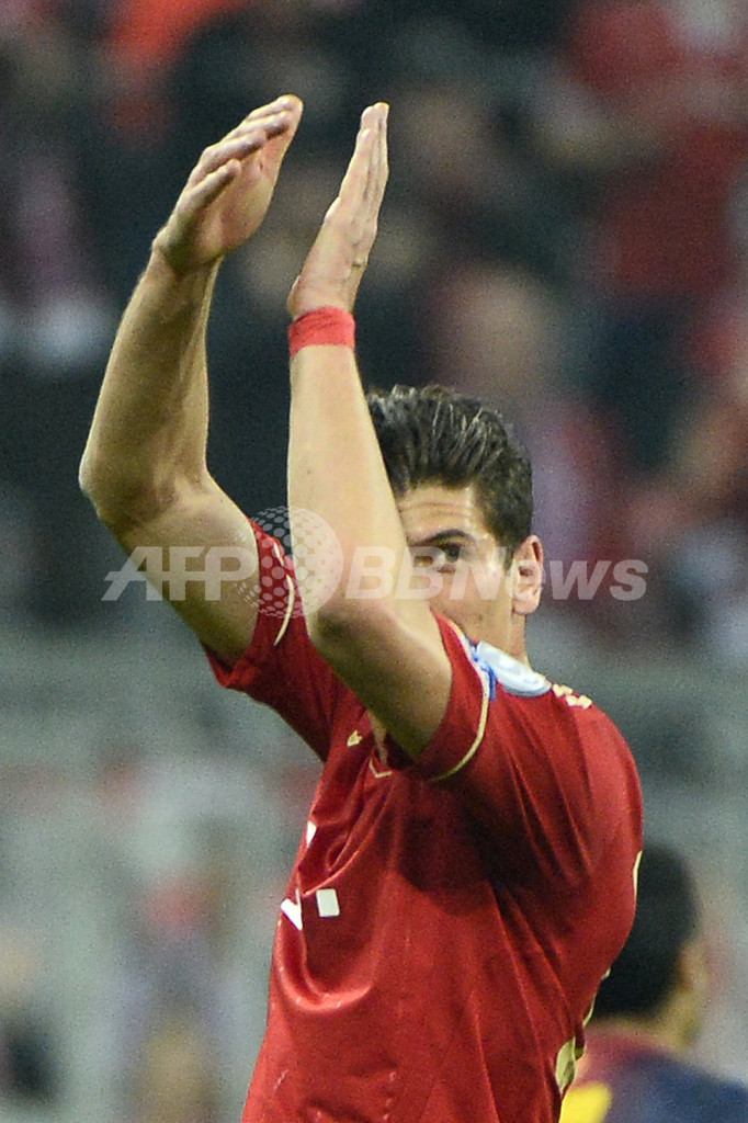 歓声に応えるバイエルン・ミュンヘンのマリオ・ゴメス(Mario Gomez、2013年4月23日撮影)。(c)AFP/PIERRE-PHILIPPE MARCOU
