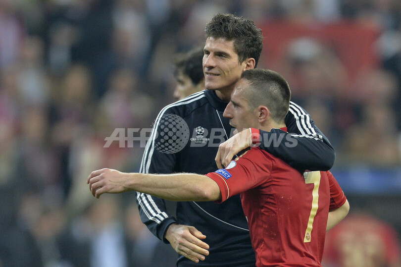 試合後に勝利の喜びを分かち合うバイエルン・ミュンヘンのマリオ・ゴメス(Mario Gomez、左)とフランク・リベリ(Franck Ribery、2013年4月23日撮影)。(c)AFP/ODD ANDERSEN