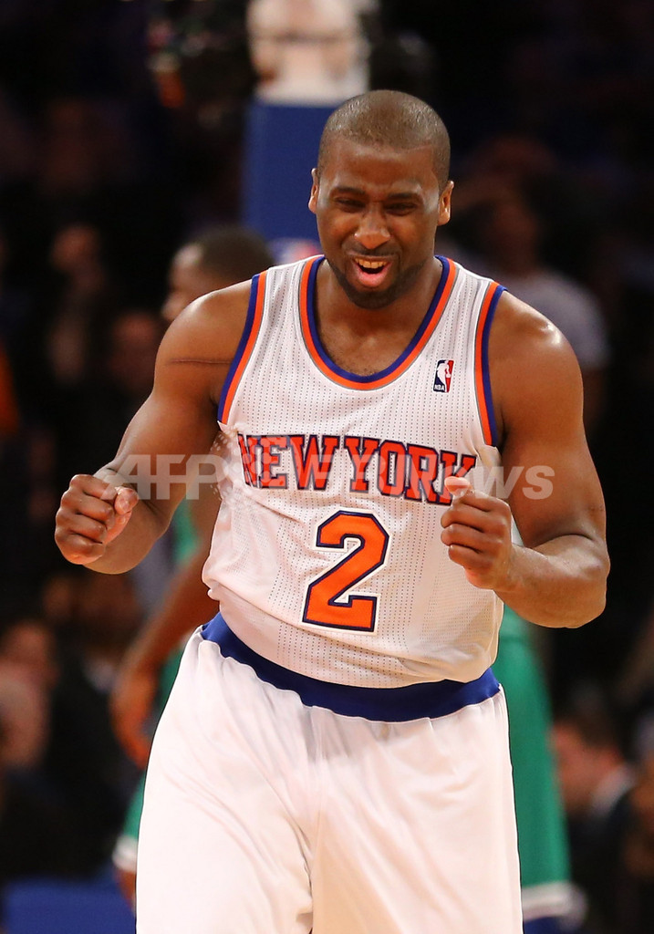 歓喜するニューヨーク・ニックスのレイモンド・フェルトン(Reymond Felton、2013年4月23日撮影)。(c)AFP/Getty Images/NBAE/Al Bello
