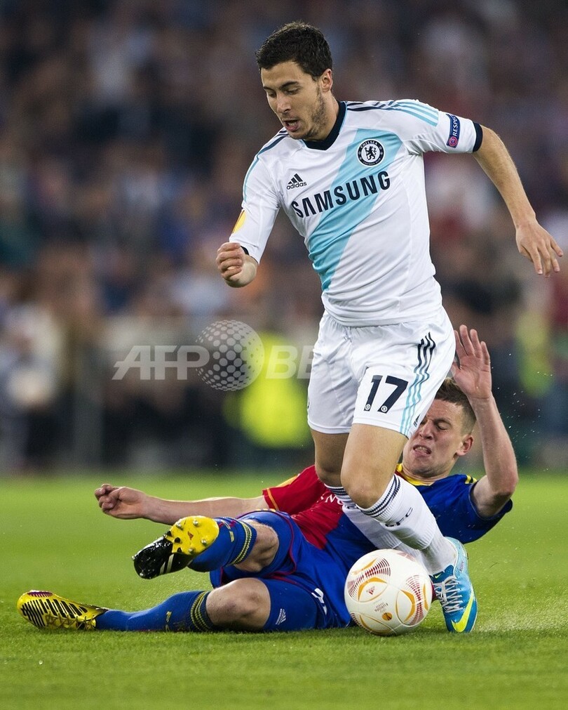 FCバーゼルのファビアン・フレイ(Fabian Frei)を振り切るチェルシーのエデン・アザール(Eden Hazard、2013年4月25日撮影)。(c)AFP/FABRICE COFFRINI