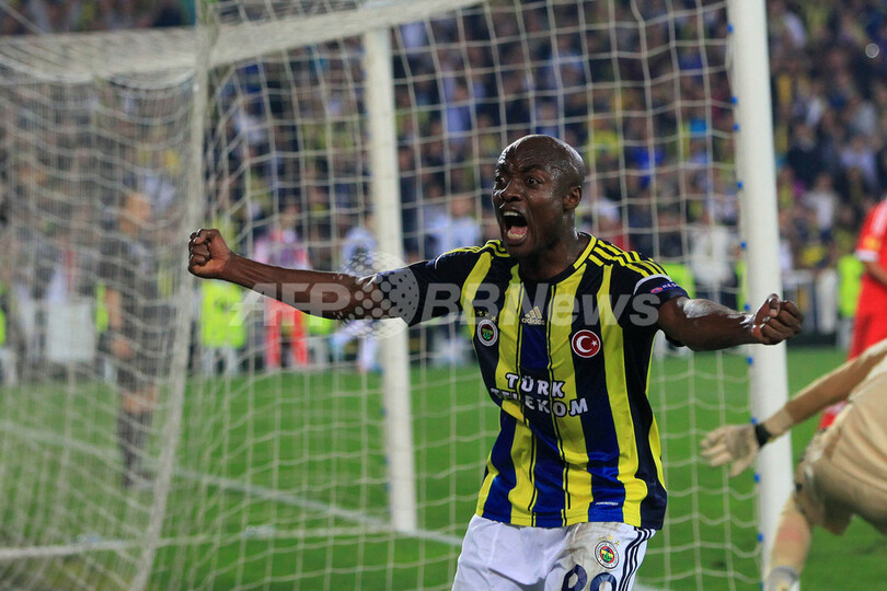 チームの得点に歓喜するフェネルバフチェのジョセフ・ヨボ(Joseph Yobo、2013年4月25日撮影)。(c)AFP/MIRA