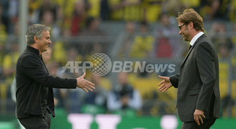 試合前に挨拶するレアル・マドリードのジョゼ・モウリーニョ(Jose Mourinho)監督とボルシア・ドルトムントのユルゲン・クロップ(Juergen Klopp)監督(2013年4月24日撮影)。(c)AFP/PATRIK STOLLARZ