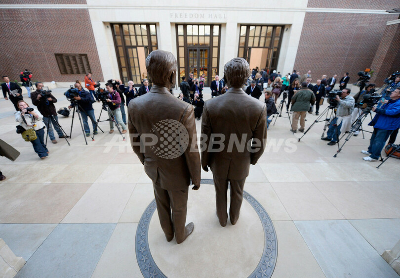 写真は、館内に展示されたブッシュ前大統領と父親のジョージ・H・W・ブッシュ(George H.W. Bush)元大統領の銅像(2013年4月24日撮影)。(c)AFP/Getty Images/Kevork Djansezian