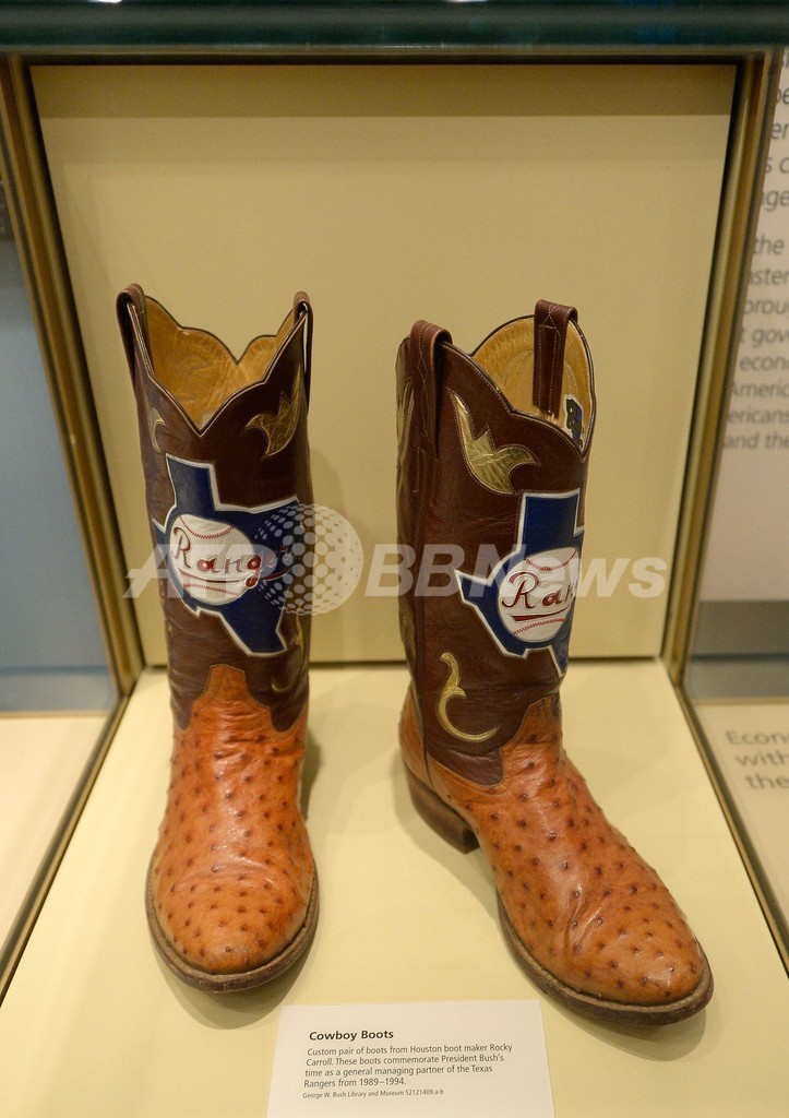 写真は、館内に展示されたブッシュ前大統領のプロ野球大リーグのテキサス・レンジャーズ共同オーナー時代を記念したブーツ(2013年4月24日撮影)。(c)AFP/Getty Images/Kevork Djansezian