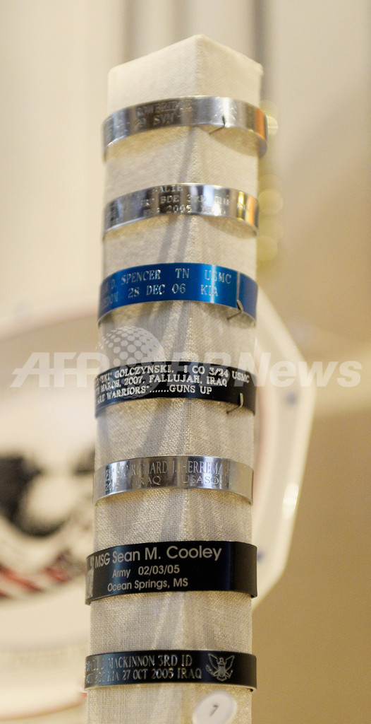 写真は、イラク戦争で戦死したりイラク軍に身柄を拘束された米軍人の家族がブッシュ氏に贈った記念ブレスレット(2013年4月24日撮影)。(c)AFP/Getty Images/Kevork Djansezian
