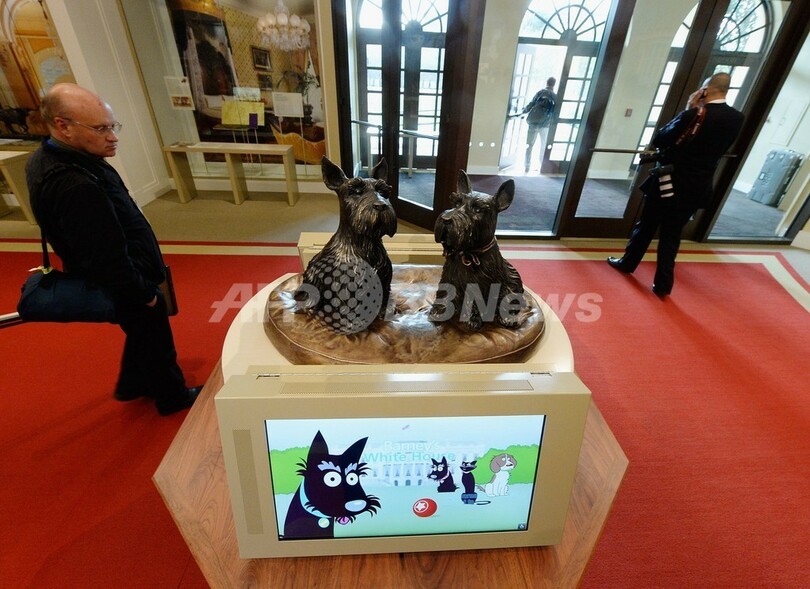 写真は、館内に展示されたブッシュ家の愛犬バーニー(Barney)とミス・ビーズリー(Miss Beazley)の銅像(2013年4月24日撮影)。(c)AFP/Getty Images/Kevork Djansezian