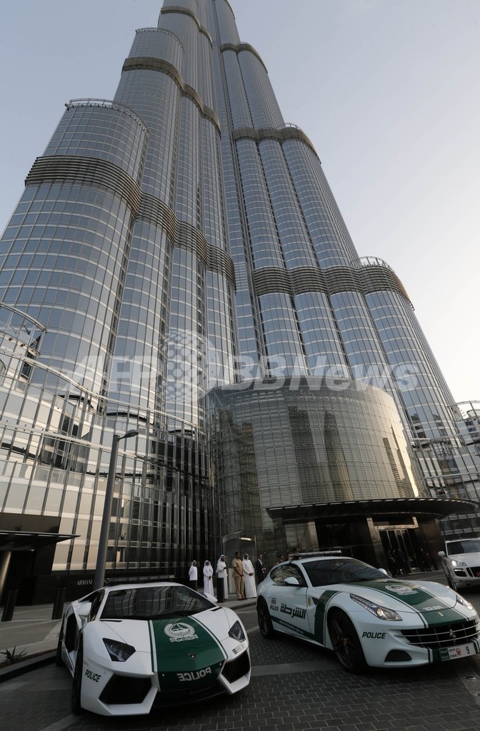 写真は、ブルジュ・ハリファ前に駐車された「フェラーリパトカー」(右)と「ランボルギーニ・パトカー」(2013年4月25日撮影)。(c)AFP/KARIM SAHIB