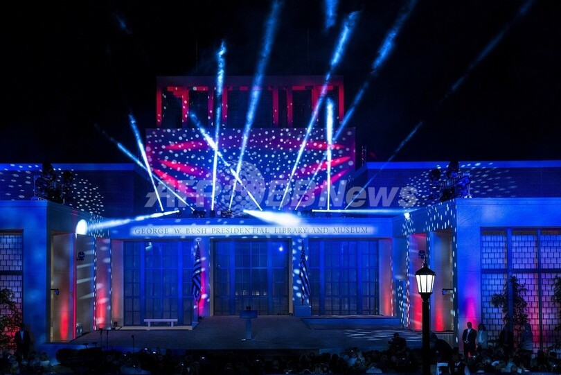 【4月26日 AFP】米テキサス(Texas)州ダラス(Dallas)の南メソジスト大学(Southern Methodist University)で25日に行われたジョージ・W・ブッシュ(George W. Bush)前米大統領(66)の業績を記録した「大統領図書館」の開館式典は、盛大な花火で幕を閉じた。