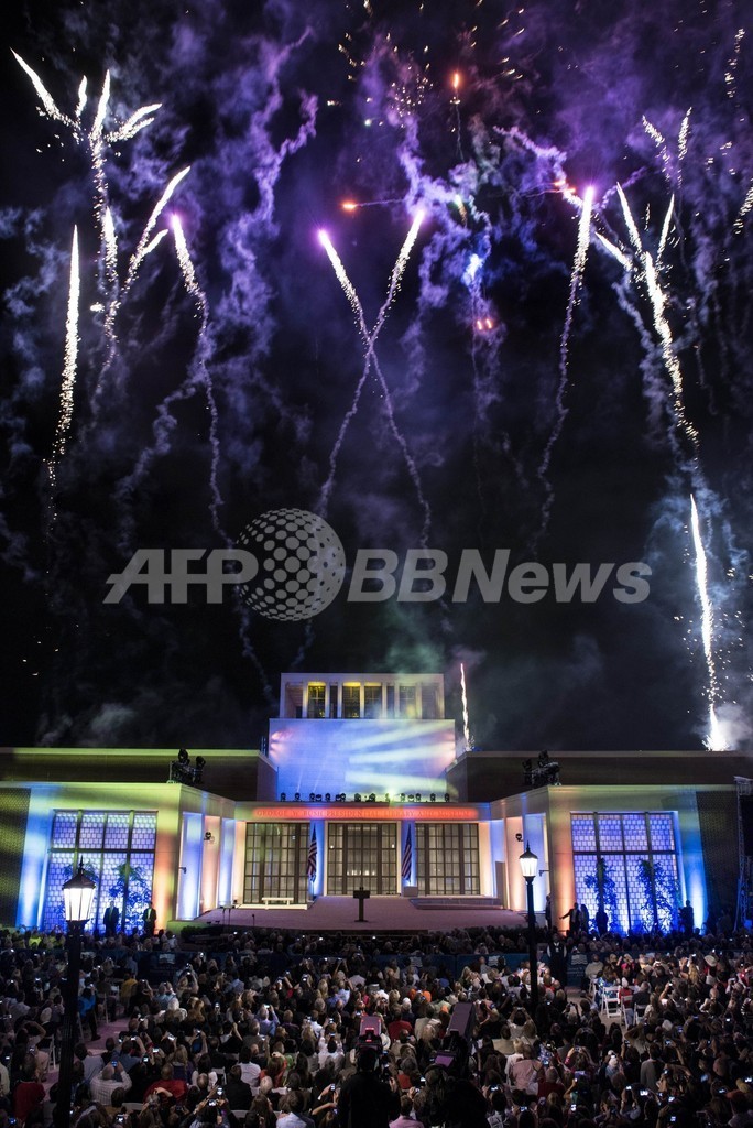 【4月26日 AFP】米テキサス(Texas)州ダラス(Dallas)の南メソジスト大学(Southern Methodist University)で25日に行われたジョージ・W・ブッシュ(George W. Bush)前米大統領(66)の業績を記録した「大統領図書館」の開館式典は、盛大な花火で幕を閉じた。
